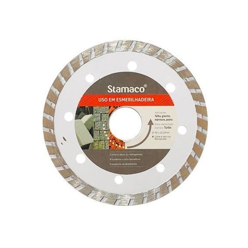 O Disco Diamantado Turbo Esmerilhadeira 110×22.23mm Stamaco é ideal para cortes rápidos e precisos em materiais como concreto, pedra, cerâmica e porcelanato. Com a tecnologia turbo, oferece maior agilidade no corte e melhor dissipação de calor, garantindo um desempenho superior e durabilidade prolongada.